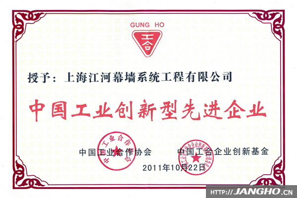10月22日,中國工業合作協會第四次全國會員代表大會在北京召開。十屆全國人大常委會副委員長顧秀蓮、十屆全國政協副主席李貴鮮、中國工合理事長高宗銀等領導出席。會議表彰了在建設創新型企業方面做出突出成績的先進企業和為中國工業合作協會做出杰出貢獻的先進個人,共授予了12家企業“中國工業創新型先進企業”稱號。上海江河幕墻系統工程有限公司以其在管理創新、技術創新、產品創新以及文化創新上的突出成就獲此殊榮。